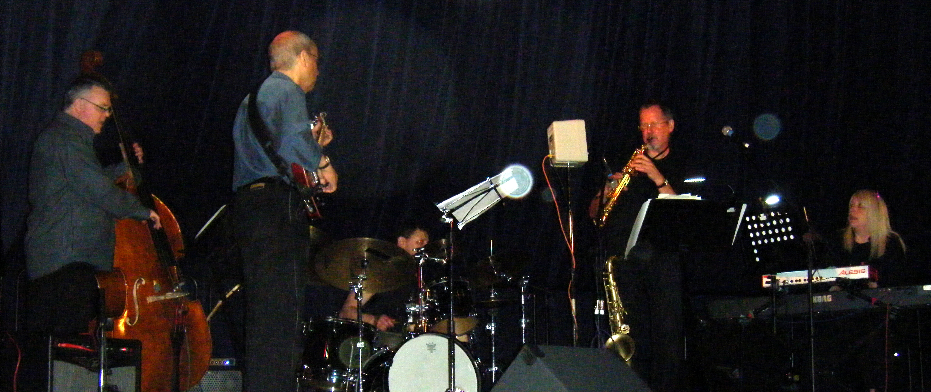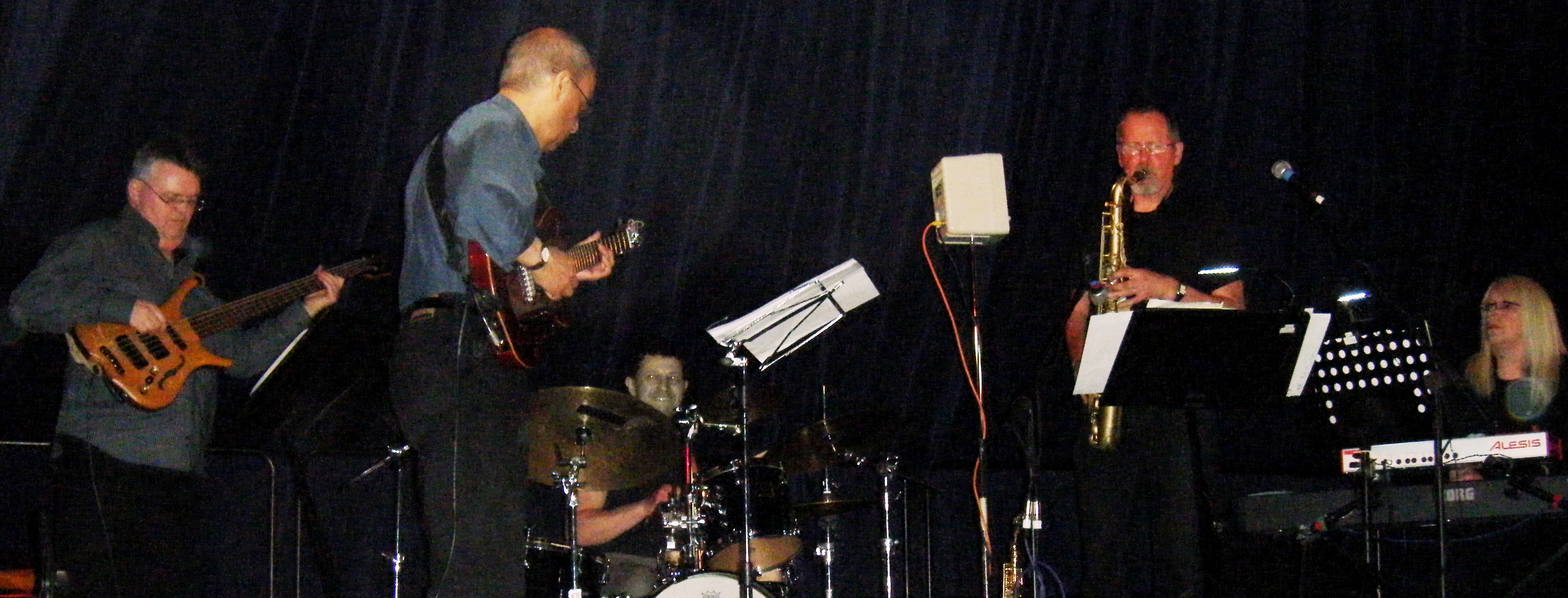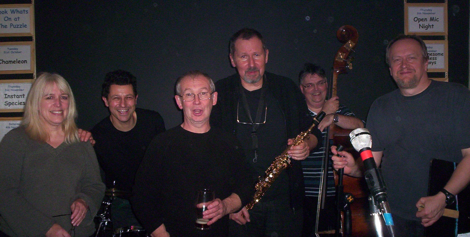 Chameleon:1982-2015. 33 years, mostly in and occasionally out of the wilderness. Photography; Barbara Neville, March 2012. Formed in 1982 in the North-East of England, and from the early 21st century pursuing its low-key campaign for world domination from a base in the North-West, Chameleon specialised in a brand of feel-good groove-orientated jazz-funk for which it established a loyal following and a solid reputation in the UK and abroad. Throughout thirty-three years playing this music with energy, passion and respect, mixing inventive arrangements of the work of the masters with original material from current and past members, the band combined disciplined musicianship with a sense of fun, playing whenever and wherever the opportunity arose. In February 2015 the decision was taken to wind up the band as a regular working unit, although we hope it will re-emerge from time to time in response to special requests and commissions. Thanks to everyone who has supported us in so many ways over so many years. Without all of you none of it would have happened, and there'd be a lot fewer happy memories out there. Chameleon 2014: Gary Boyle, Guitars; Tim Franks, Drums; Avril Greenhow Parker, Keyboards; Stuart Johnson, Saxophones; Dave Turner, Basses. And here they are, in that order............